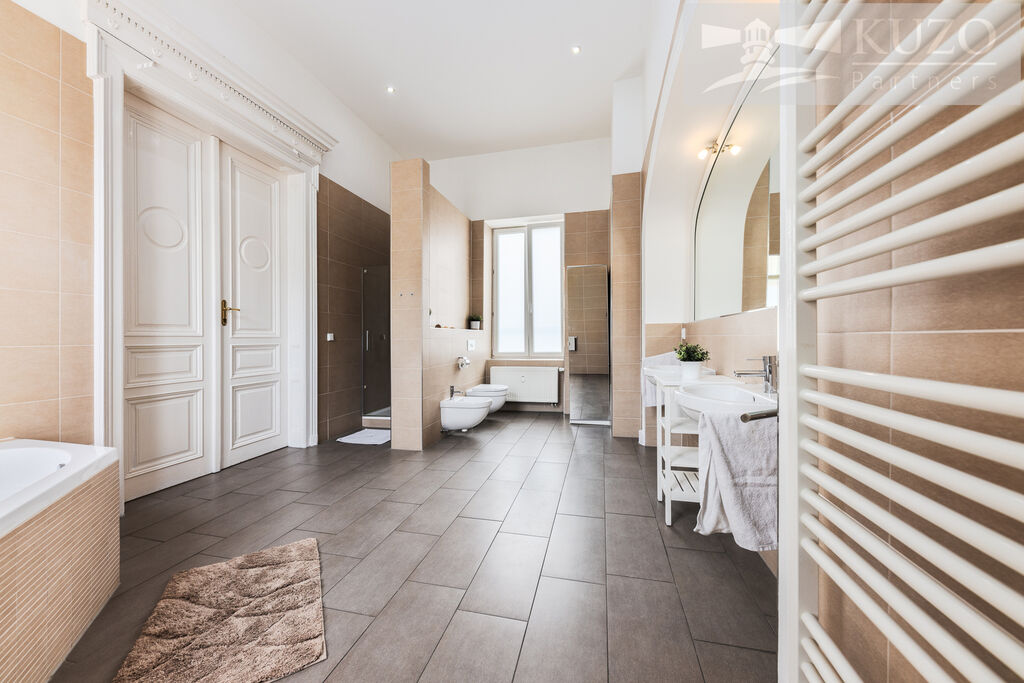 designová prosvětlená koupelna se dvěma okny (18,2 m²) s rohovou vanou, sprchovým koutem, dvěma umyvadly, WC a bidetem,