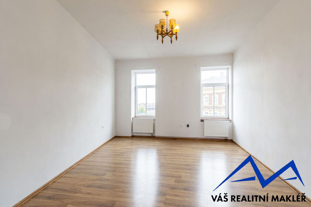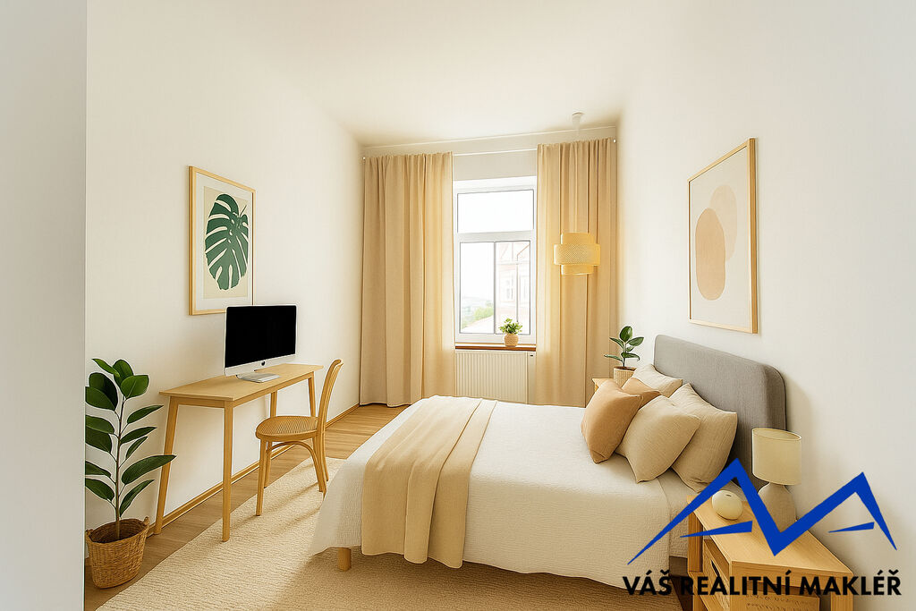 Dispozice bytu zahrnuje dvě prostorné místnosti, které mohou sloužit jako obývací pokoj a ložnice (zde prostor pro vybudování šatny).