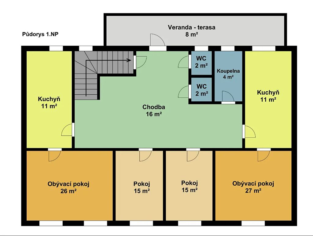 Dispozice patra je řešena jako dvě otevřeně propojené bytové části, každá s vlastní kuchyní a obývacím pokojem, propojené centrální chodbou. Je ideální pro větší rodinu, vícegenerační bydlení, případně lze přizpůsobit na dvě samostatné bytové jednotky – nebo na jeden velkorysý, prostorný byt podle vlastních představ.