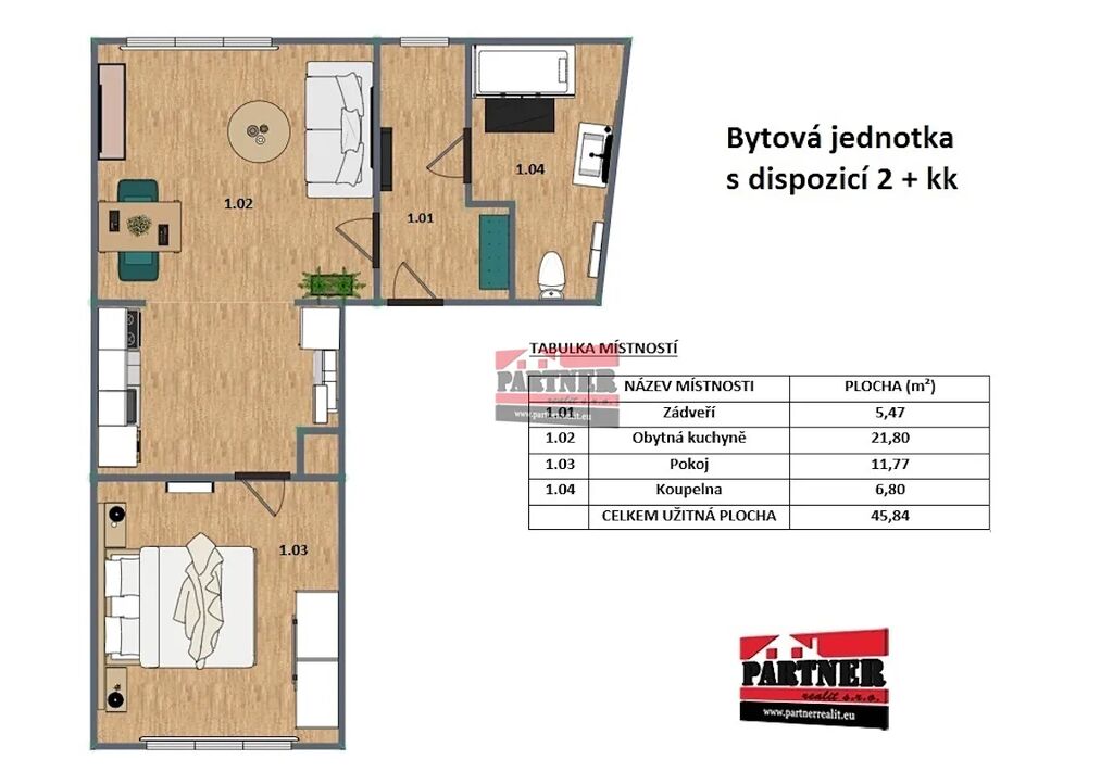 Bytová jednotka 2+1 o celkové ploše 51,9 m2 se nachází v přízemí kompletně zrekonstruovaného domu a má tuto dispozici: vstupní zádveří, obývací pokoj, kuchyně s kuchyňským koutem včetně nové moderní kuchyňské linky se spotřebiči (sklokeramická deska, trouba, lednice, myčka a digestoř), ložnice, koupelna se sprchovým koutem a toaletou.