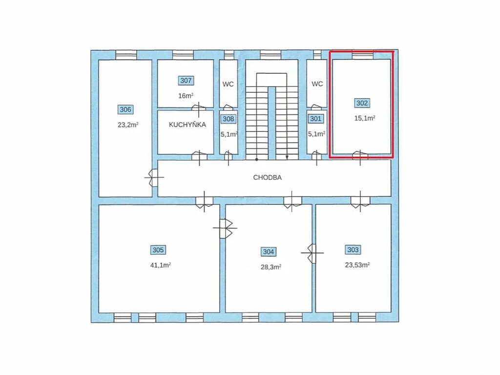 Kancelář č. 302 o ploše 15 m se nachází ve 3. nadzemním podlaží budovy s okny orientovanými do klidného dvora. Pro nájemce kanceláří je v domě možnost využít zasedací místnost s projektorem, na patře je společná kuchyňka, WC, pro chvíle odpočinku a relaxu v letních měsících je na dvorku za domem k využití venkovní posezení.