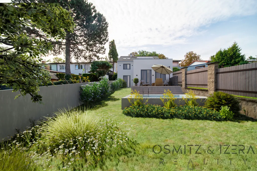 Před domem se nachází malá předzahrádka o ploše cca 36 m² a za domem se rozprostírá velká zahrada s výměrou 327 m², která je dobře přístupná a nabízí příjemné místo pro relaxaci. Na zahradě je také garáž pro jeden automobil a menší zděná kůlna. Celková plocha pozemku činí 449 m², přičemž zastavěná plocha je zhruba 86 m². Podélný tvar zahrady a její orientace zaručuje téměř celodenní sluneční svit, což je ideální pro zahradničení, rodinné aktivity nebo třeba wellness zónu. Zahrada a garáž je přístupná i ze zadní části po asfaltové komunikaci což je veliký benefit.
