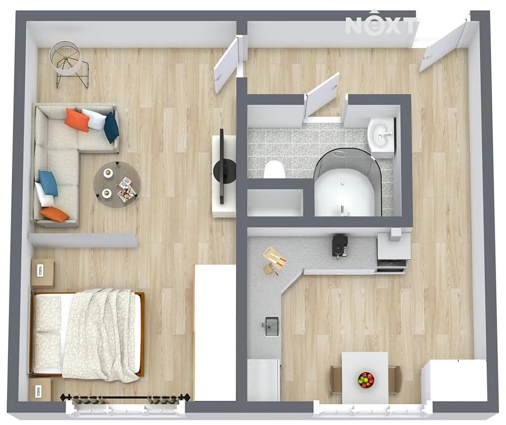 Byt poskytuje praktickou dispozici 1+1, dvě obytné místnosti, navíc prostornou chodbu, koupelnu a WC. Nedílnou součástí je lodžie umístěná v mezipatře, která nabízí příjemný prostor k odpočinku.