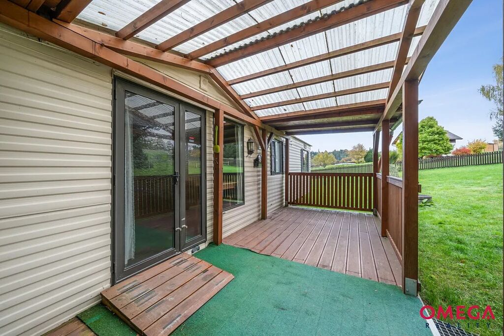 Kombinace chaty a mobilheimu nabízí komfortní zázemí pro víkendový odpočinek i delší pobyt. Vejde se tu bez problémů celá rodina nebo