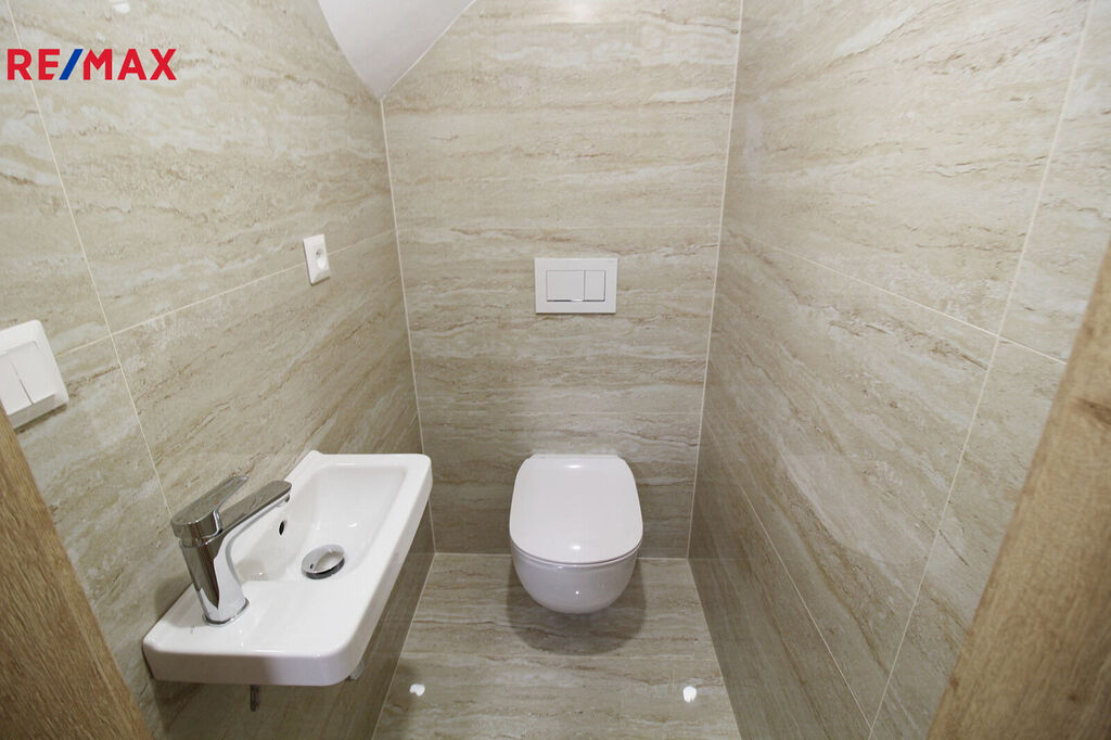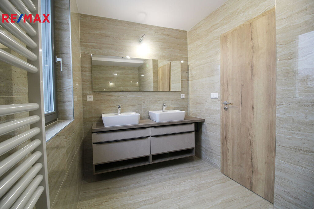 V kuchyni je kuchyňská linka renomované společnosti Karel Kováč centrum s. r. o., s vestavěnými spotřebiči a indukční varnou deskou značky Siemens.