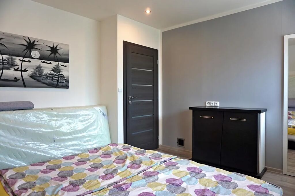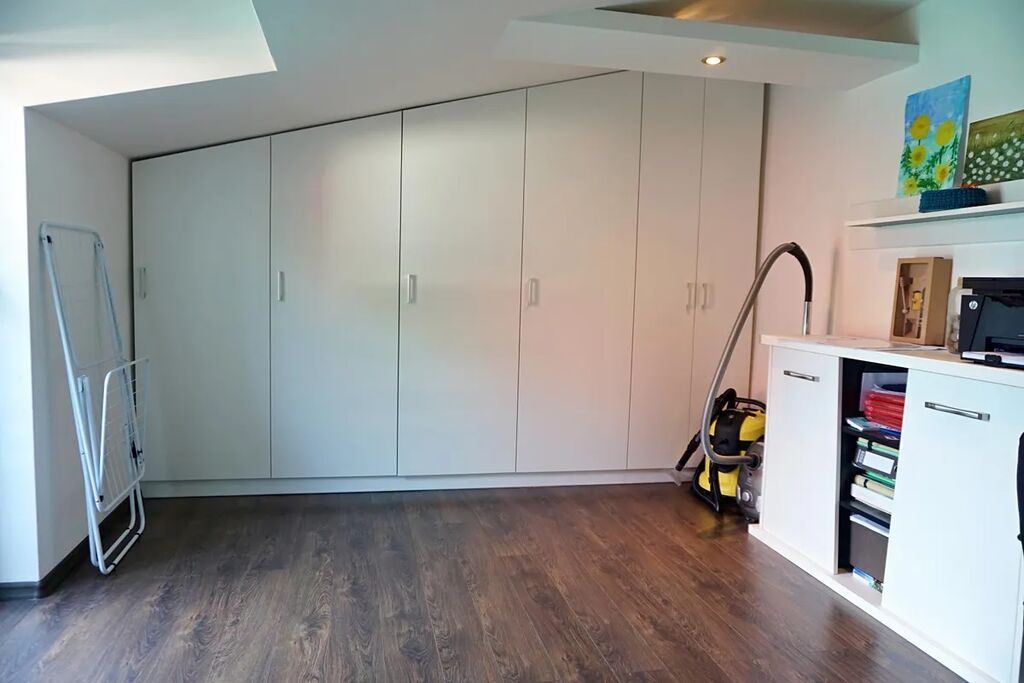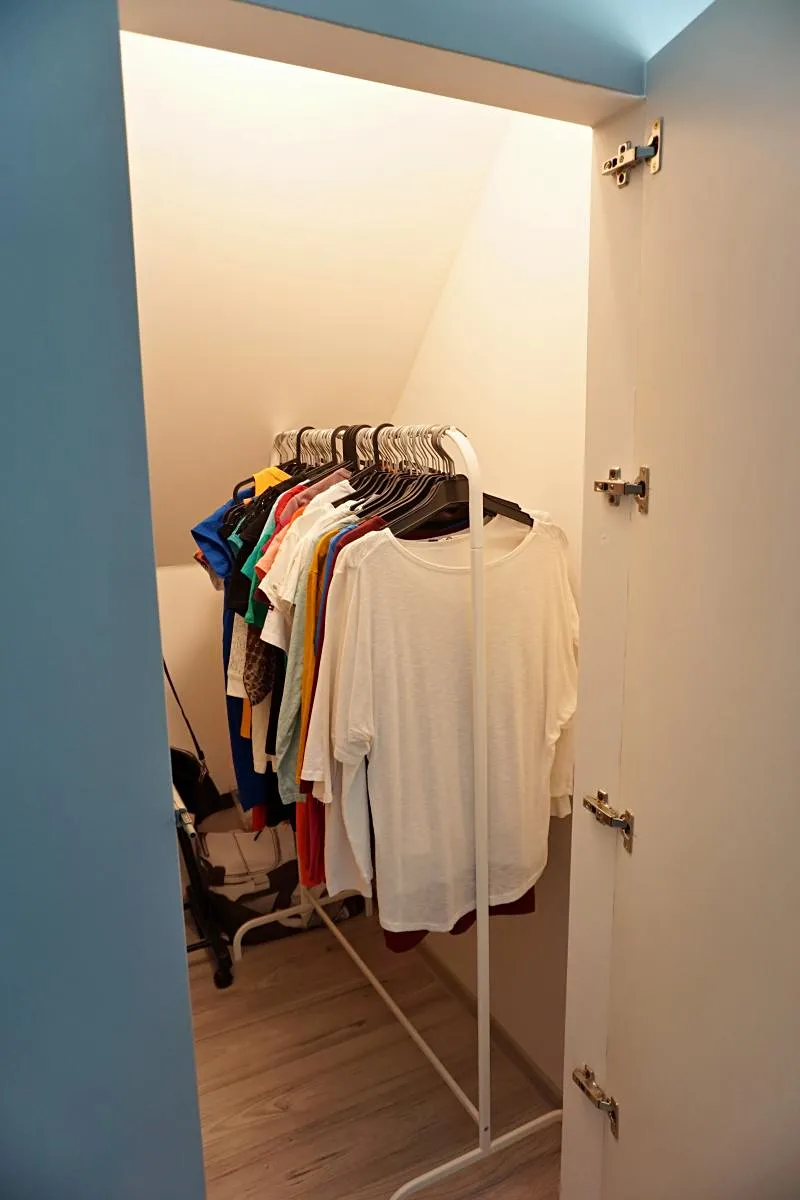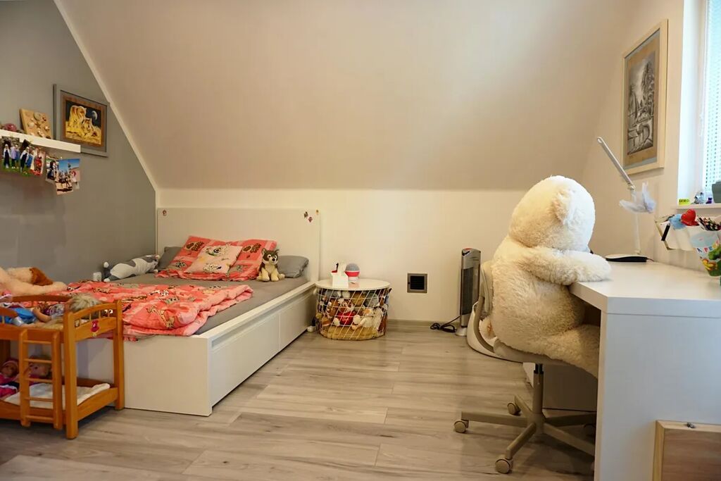 V patře se nachází ložnice, kde za zrcadlem je důmyslně umístěný prostor pro šatnu. Dále je v patře dětský pokoj s terasou. Tento pokoj má opět skrytou místnost, kdy za zrcadlem je průchod do technické místnosti. Zde je umístěn elektrický ohřívač vody a elektrokotel. V patře je dále druhá koupelna s vanou a závěsným WC. Podlahy v pokojích jsou plovoucí, v koupelně je dlažba.