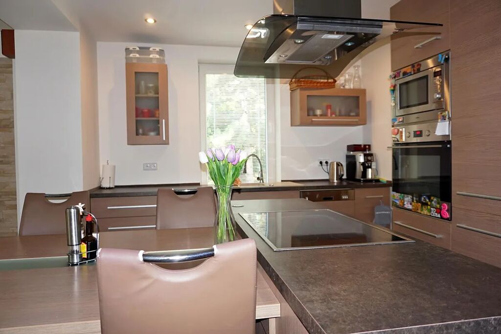 Kuchyňská linka v domě je nadstandardní, obsahuje ostrůvek se sklokeramickou deskou a úložnými prostory. Nad ostrůvkem je designová digestoř. V další části kuchyňské linky naleznete vestavěnou elektrickou troubou, vestavěnou mikrovlnou troubu, myčku na nádobí, granitový dřez a velké množství úložných prostor. Podlahy jsou plovoucí, na chodbě a v koupelně je dlažba. V prostoru kuchyně spojené s obývacím prostorem najdete krb.