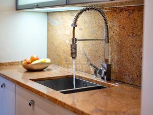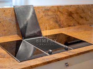 Dominantou bytu je prostorný obývací pokoj s moderní kuchyní, která nabízí praktický ostrůvek, vestavné spotřebiče, dostatek úložného prostoru a navíc je vybavena zabudovaným grilem a drtičem odpadu.