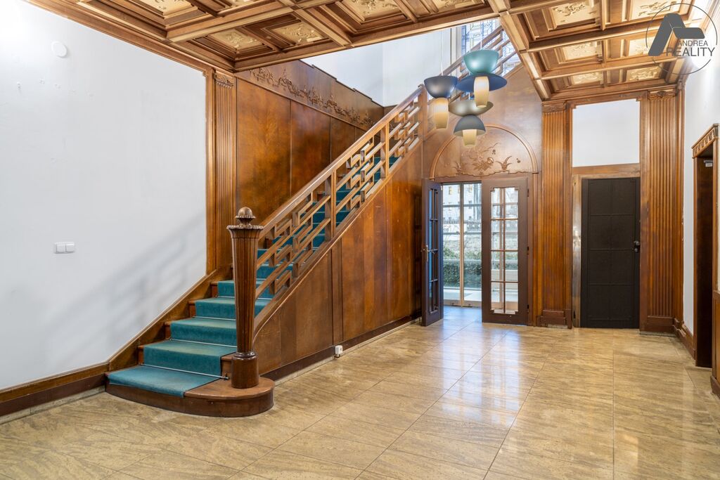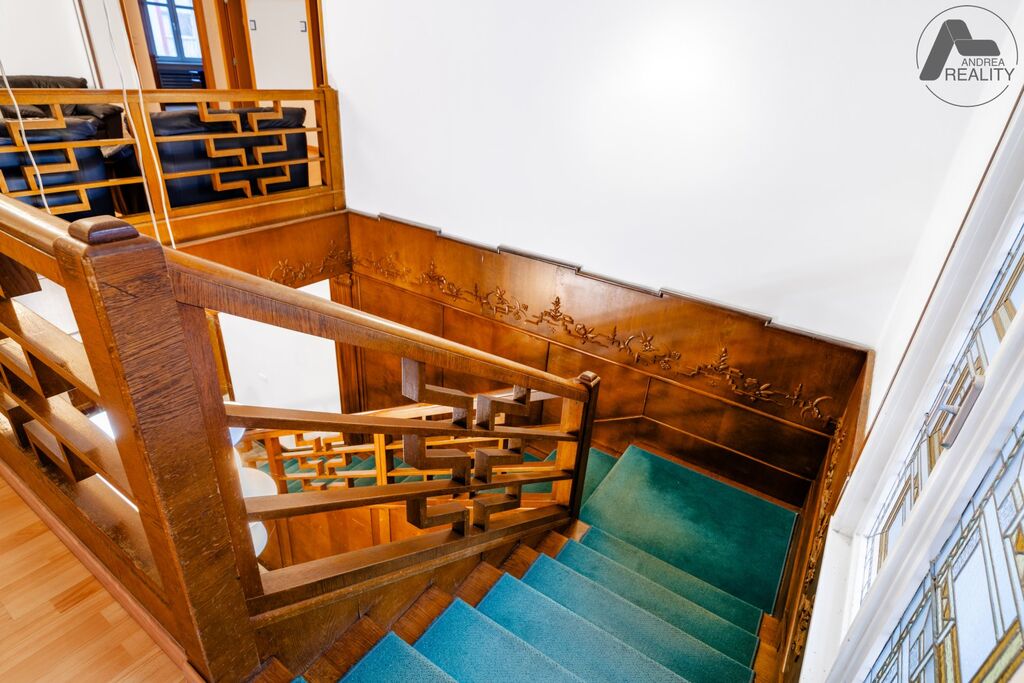 Jádro domu tvoří jednopatrová schodišťová hala anglického typu, s bohatě členěnými dřevěnými stěnami a stropem zdobeným uměleckým dekorem ve stylu art deco. Vila má celkem 4 podlaží s podlahovou plochou 686m2, prostorné nádvoří s 12 parkovacími místy, ideálními pro vaše obchodní partnery nebo klienty. Zastavěná plocha a nádvoří má rozlohu 286m2, parkovací plocha 920 m2.