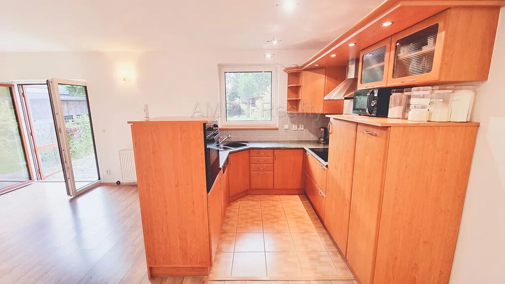Dům sestává z velmi prostorného obývacího pokoje s kuchyňským koutem a krbem, 3 dalších obytných pokojů, haly, samostatné šatny, koupelny, 2 WC, předsíně a technické místnosti (skladu, komory). Kuchyňský kout je vybavený moderní kuchyňskou linkou se spotřebiči (vestavěné: lednice s mrazákem, sklokeramická varná deska, digestoř, el. trouba na pečení, velká myčka nádobí, volně: mikrovlnná trouba). Z obývacího pokoje lze vyjít na osvětlenou terasu 25 m2 v zahradě. V koupelně se nachází 2 umyvadla, velký sprchový kout a WC, druhé WC s umyvadlem je v technické místnosti. Díky technické místnosti, kůlně a altánu dům skýtá velké množství praktických úložných prostor.