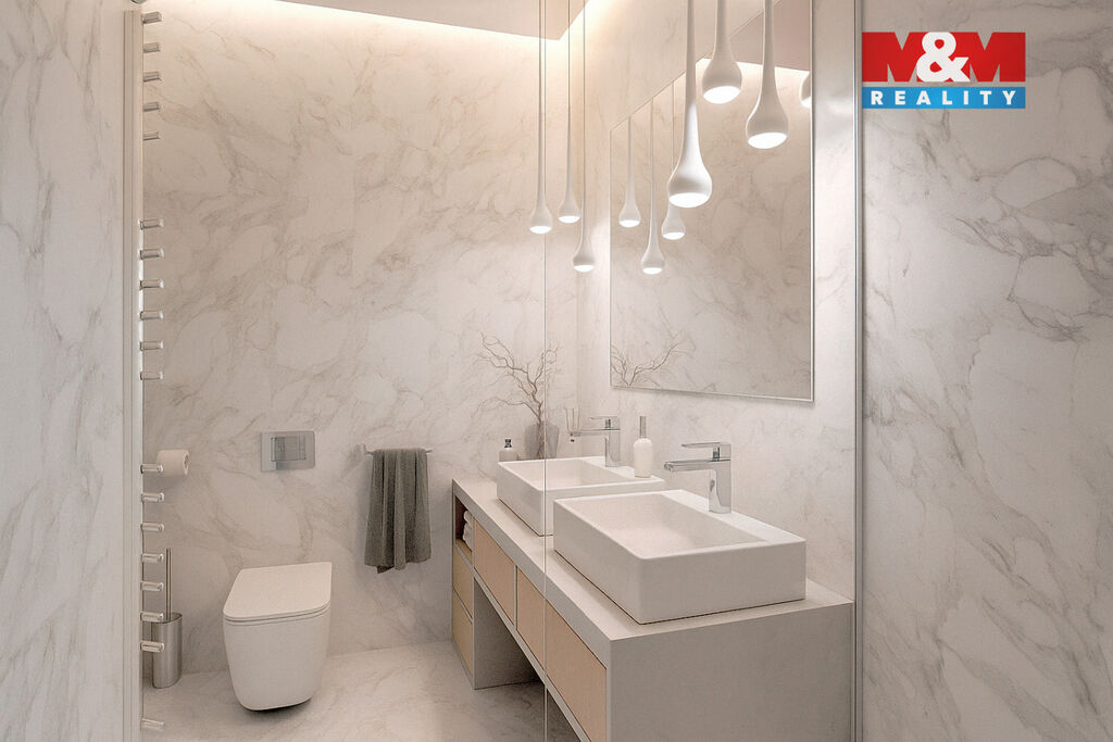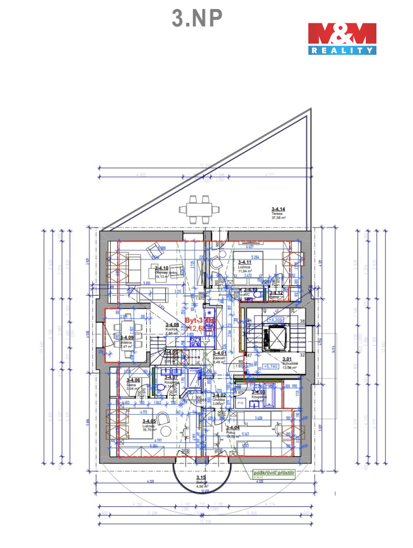 Celková plocha bytu činí 154 m² a doplňuje ji prostorná terasa 38 m², balkon 19 m² a sklepní kóje 6 m².