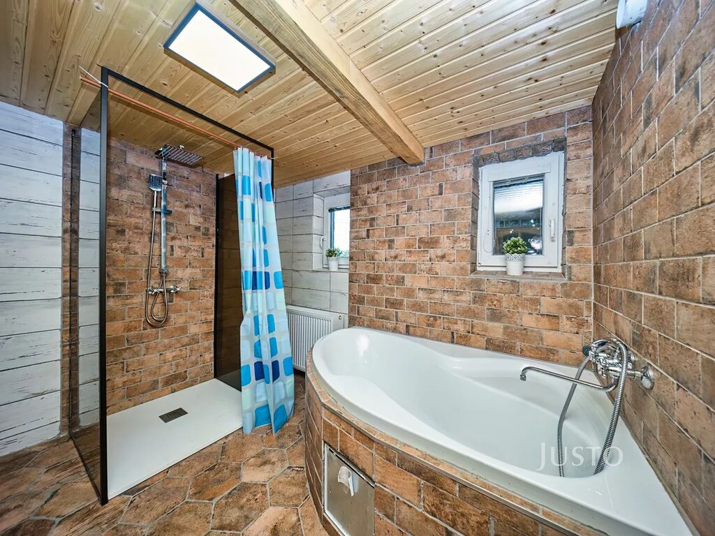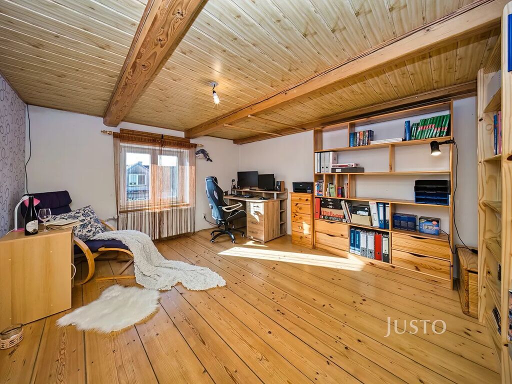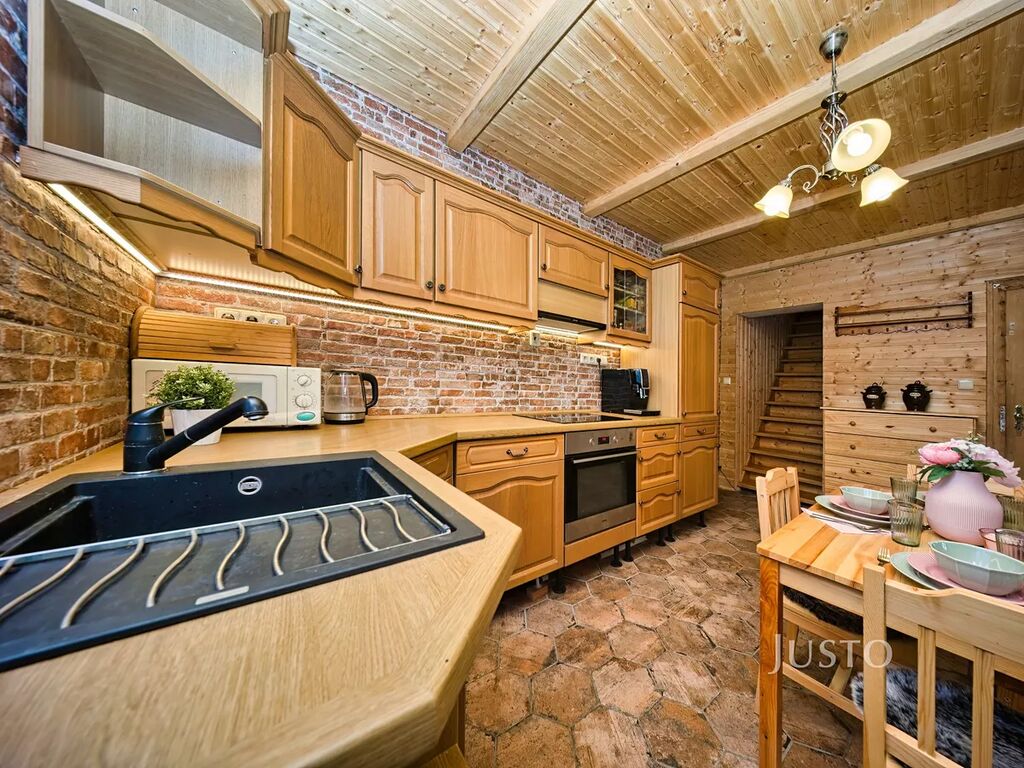 V zastoupení majitele nabízíme k prodeji rodinný dům ve stylu roubenky o dispozici 4+kk. V domě je ve velké míře použito dřevo, aby dům působil útulným dojmem. V přízemí domu se nachází předsíň, na kterou navazuje kuchyně propojená s obývacím pokojem. V obývacím pokoji jsou velká kachlová kamna, která navozují příjemnou a pohodovou atmosféru domu( majitelé si kamna sice odvezou, ale nový majitel si může vyřešit vytápění podle svých přestav.) Podlaha je z ošetřených borovicových prken a strop je obložen dřevem. Obývací pokoj přímo navazuje na kuchyni a tvoří jeden velký otevřený prostor, kdy může být celá rodina neustále v kontaktu.