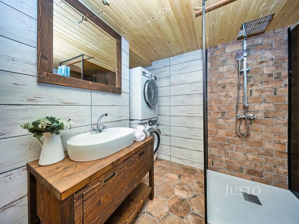 V přízemí domu je také koupelna, kde je vana i sprchový kout a umyvadlo. Toaleta je v přízemí řešena samostatně. Za koupelnou jsou i úložné prostory pro skladování potravin.