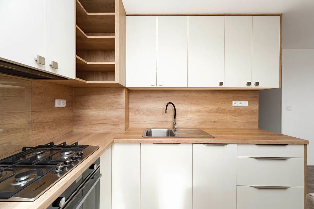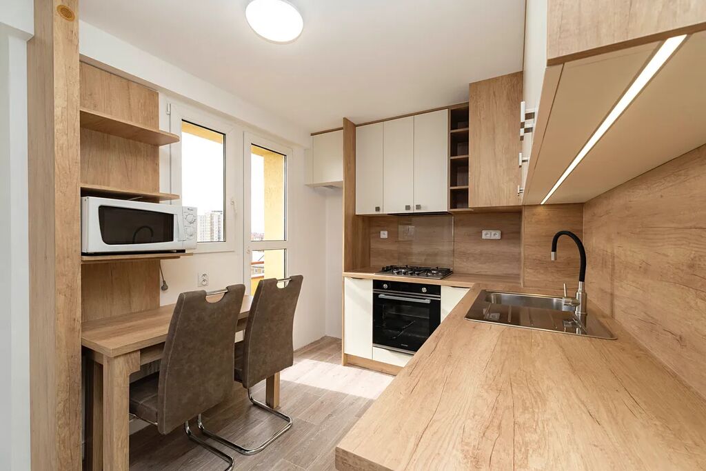 kuchyně s novou linkou v moderním designu, vybavená vestavěnou troubou, plynovou varnou deskou, digestoří, myčkou, a mikrovlnnou troubou,