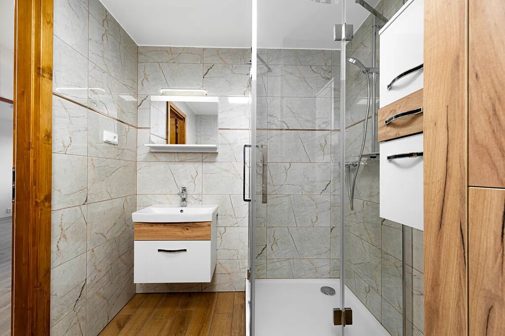 koupelna se sprchovým koutem a místem pro pračku s toaletou