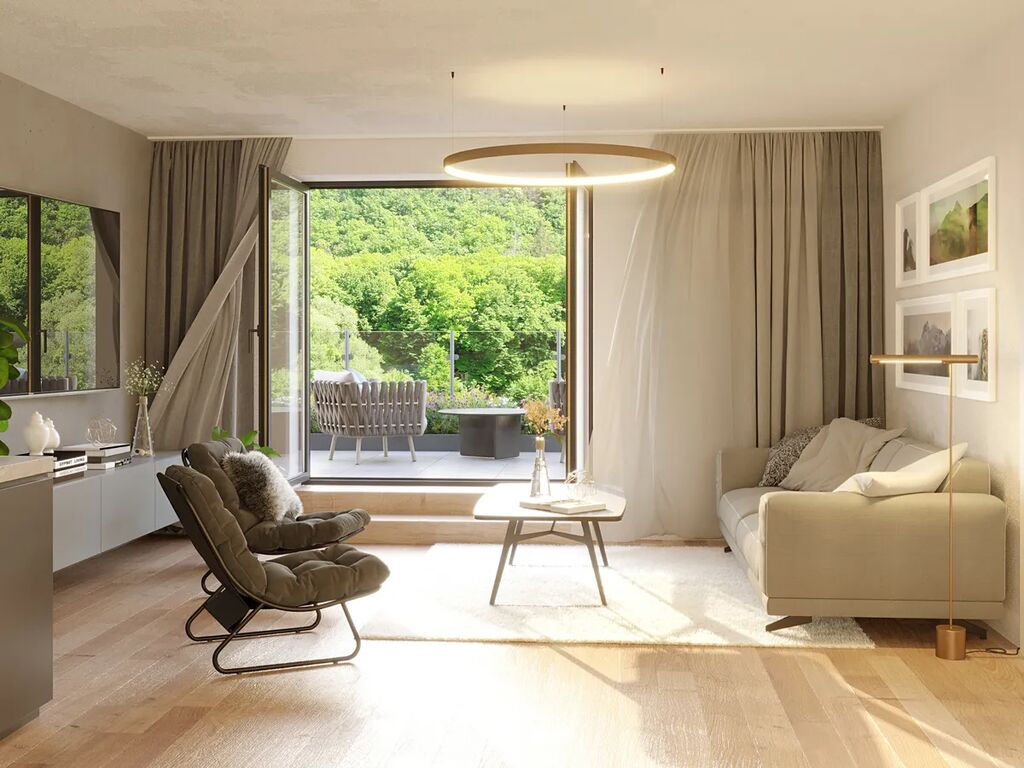Dispozice: chodba 5,12 m2, obývací pokoj s kuchyňským koutem 24,95 m2, pokoj 13,64 m2, šatna 3,47 m2, koupelna vč. WC 3,90 m2, terasy 16,61 m2, sklep 4,15 m2.