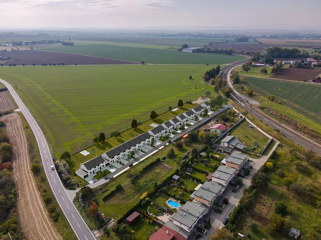 Parkování pro vozidlo před domem. Terasa pohodlně přístupná francouzskými dveřmi, pro větší soukromí mezi sousedy je oddělena dělící stěnou. Zahrada je výhodně orientovaná na jih.