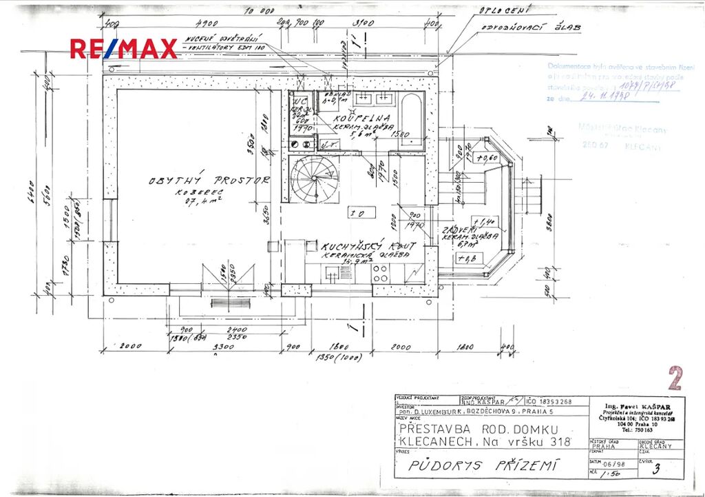 V přízemí se nachází vstupní předsíň, prostorná kuchyně propojená s obývacím pokojem, koupelna s plynovým kotlem pro vytápění i ohřev vody a samostatné WC. Obývacímu pokoji dominuje krb s krbovou vložkou, který efektivně rozvádí teplo do celého domu. Z pokoje vedou francouzské dveře na terasu a do malebné zahrady plné zeleně, kde si můžete vychutnat klid ve stínu vzrostlé třešně a krásný výhled na klecanské údolí.