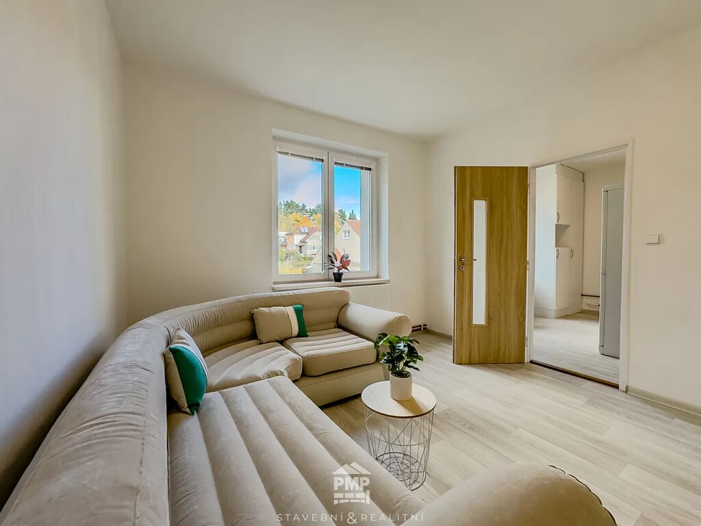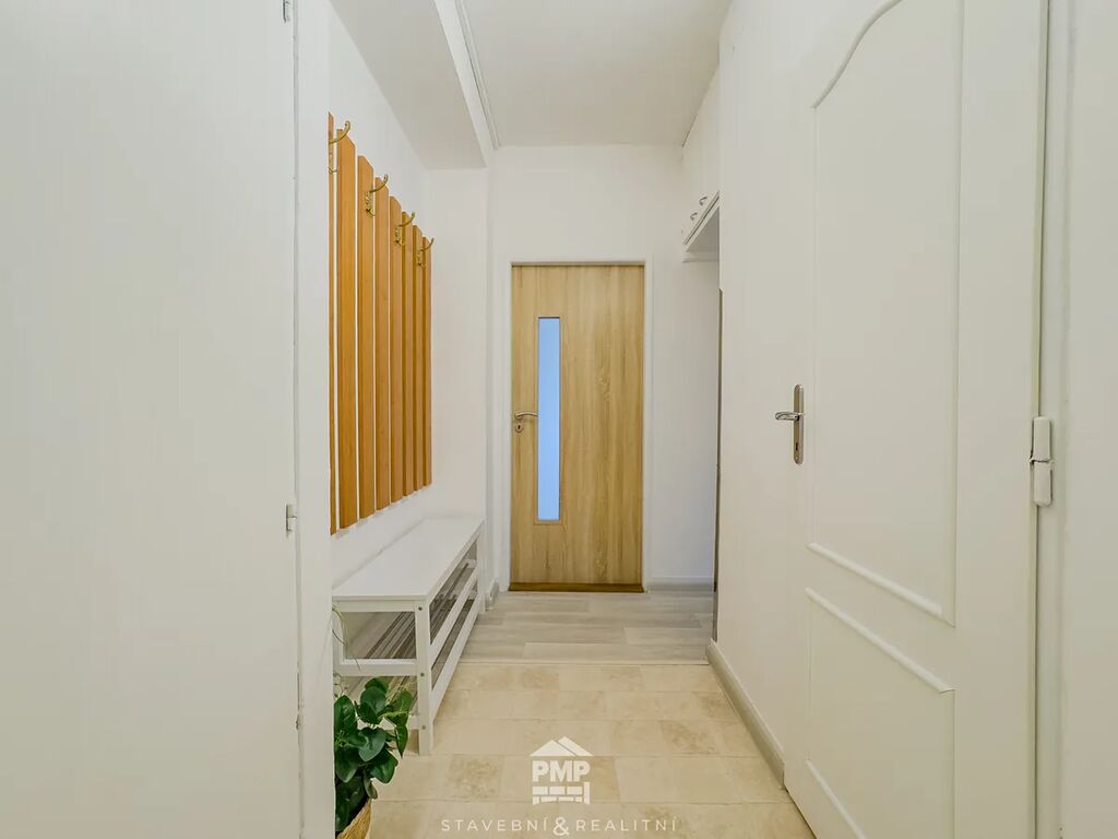 Celková užitná plocha bytu činí 62 m². Nabízí průchozí obývací pokoj přístupný z kuchyně a chodby a ložnici se vchodem na prostornou zasklenou lodžii. Koupelna je vybavena sprchovým koutem, umyvadlem, bojlerem na ohřev teplé vody a místem pro pračku. Mezi vybavení kuchyně patří lednice, plynový sporák v kombinaci s elektrickou troubou a vestavěná skříň, v níž je umístěn plynový kotel zajišťující vytápění bytu. K využívání jsou k dispozici dvě sklepní kóje (2,20 m² a 2,80 m²), které poskytují dostatek úložného prostoru. Byt je k dispozici ihned. Energetický štítek budovy: třída C.