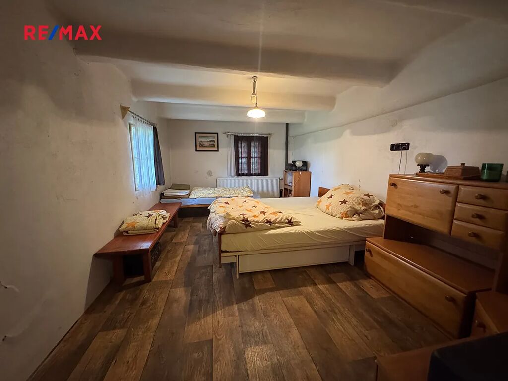 Dvoupodlažní budova dispozičně řešená jako 4+1 sestává v přízemí z kuchyně (16m2), zasedací místnosti (22m2), ložnice (16m2), samostatné WC (1,5m2), koupelny (2m2), spíže (6m2) a chodby (16m2). Schodištěm se dostaneme do prvního patra, kde je jeden menší pokoj (8m2) a velký pokoj (20m2). Vytápění je možné jak plynovým kondenzačním kotlem, tak kamny, která jsou ve všech místnostech. Nad novější cihlovou přístavbou je rozsáhlá půda. Chalupa má také menší sklípek (2,5m2) pro uchování potravin. Na malebné zahradě s vřesovištěm je postaveno posezení a kůlna. Chalupa je pravidelně udržovaná bez nutných investic ihned k užívání a celoročně dostupná po udržované obecní komunikaci.