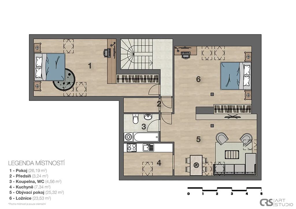 V podkroví se nyní nachází byt 1+kk 65m2, k tomuto bytu lze ale připojit ještě další nevyužívaná místnost o rozměru 26m2. Spojením byt tak byl byt, který měří 93m2 a jeho dispozice je možné využít jako 2kk nebo rozdělením 3kk.