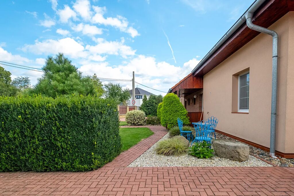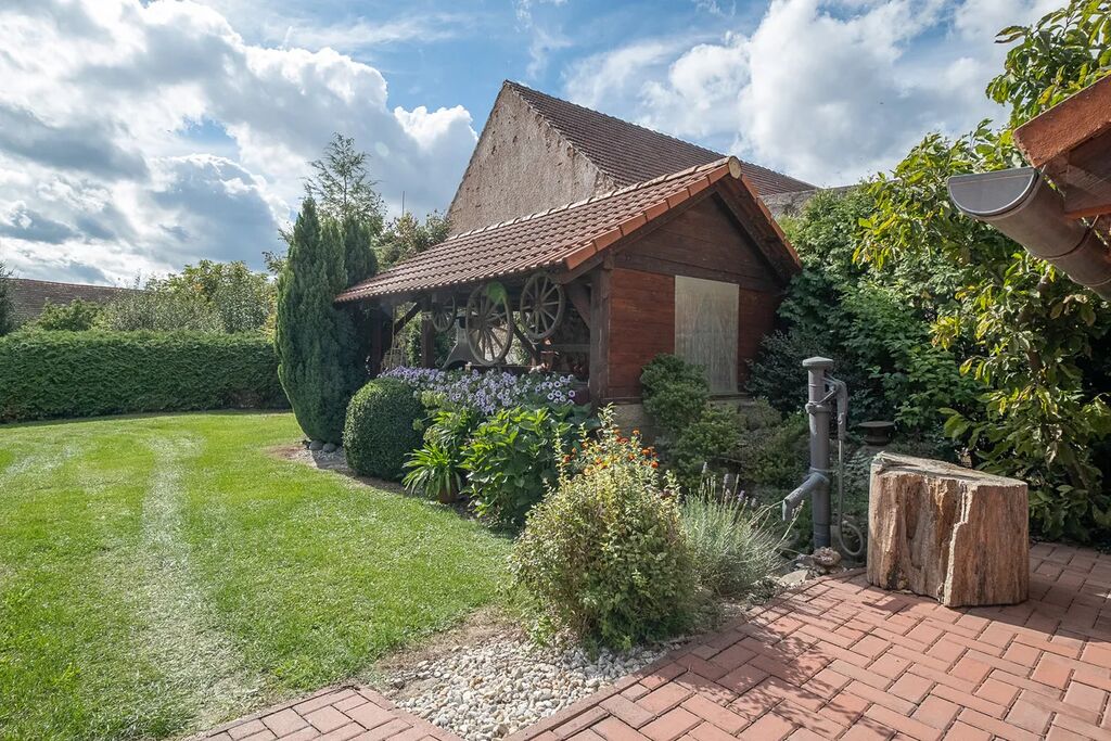 Dům vás přivítá velkou, upravenou zahradou o výměře 1 786 m², kde najdete nejen krásnou zeleň a vzrostlé dřeviny, ale také altán pro příjemné posezení, zahradní domek a sklípek.