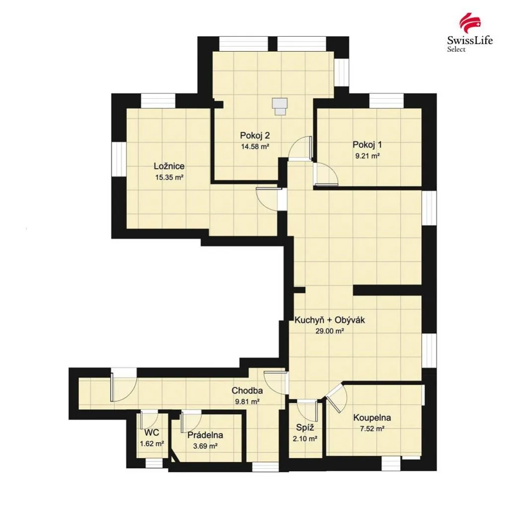 Dispozice: vstupní chodba, obývací pokoj, kuchyň s kuchyňskou linkou a vestavnými spotřebiči, tři samostatné pokoje, technická místnost, koupelna s wc a samostatné wc. K bytu náleží sklep a vlastní zahrada o výměře 325 m, která je přístupná přímo z bytu.