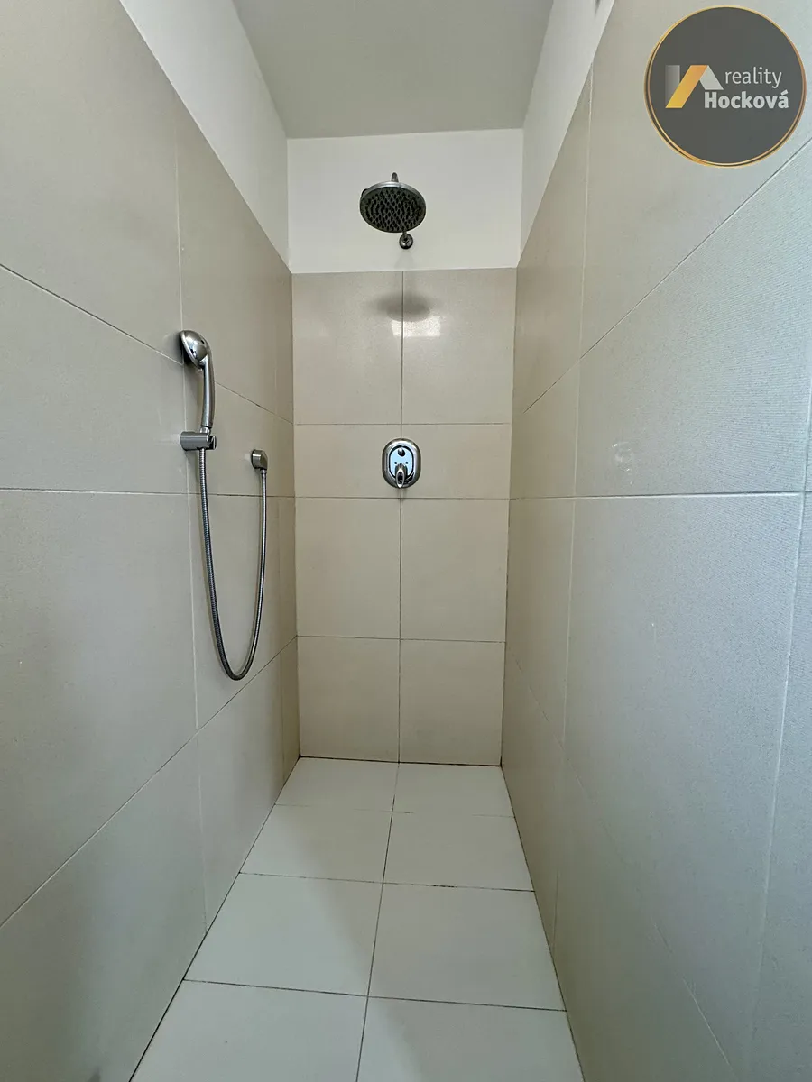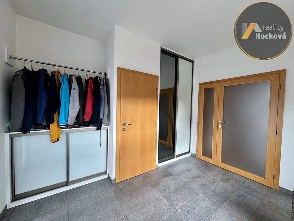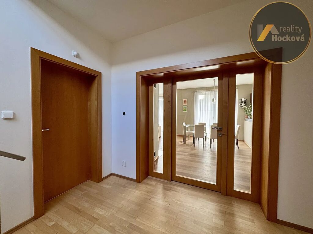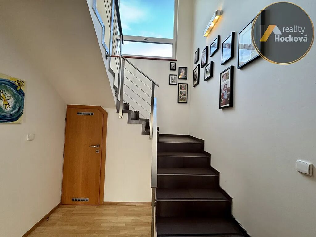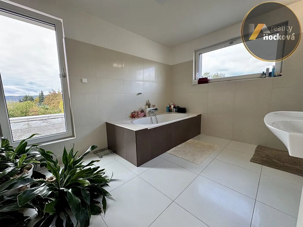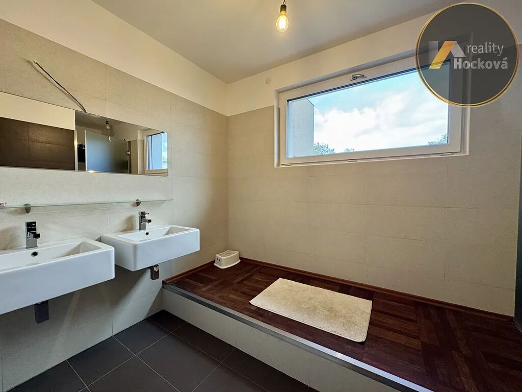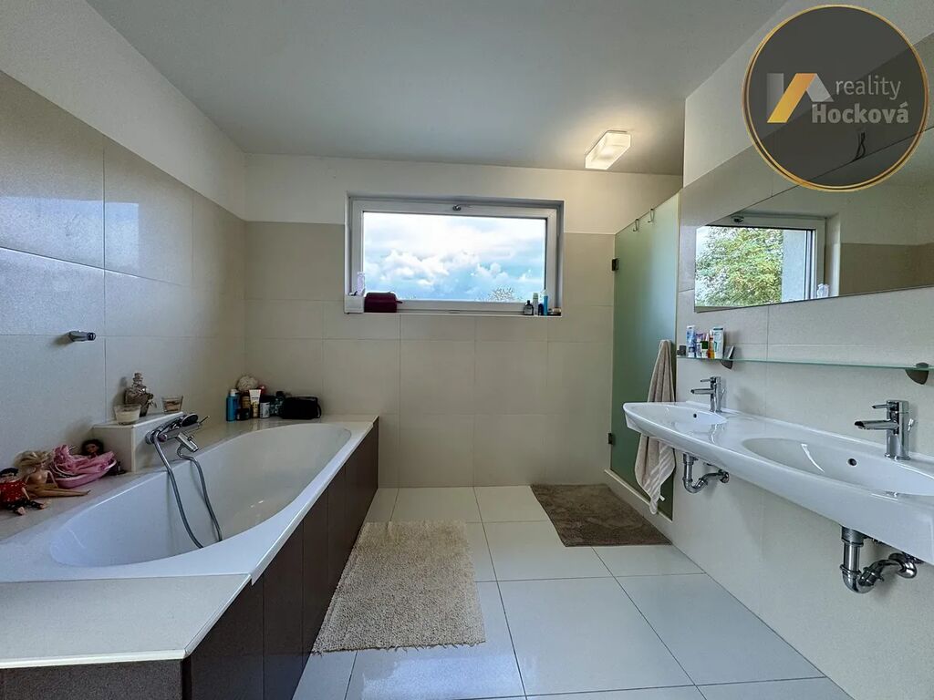 V horním podlaží se nachází pracovna, hlavní ložnice se šatnou a další dva samostatné pokoje, ze kterých je vstup na balkon s výhledem do zahrady. Dále zde najdete prostornou koupelnu s vanou, sprchovým koutem a dvojumyvadlem a samostatné WC.