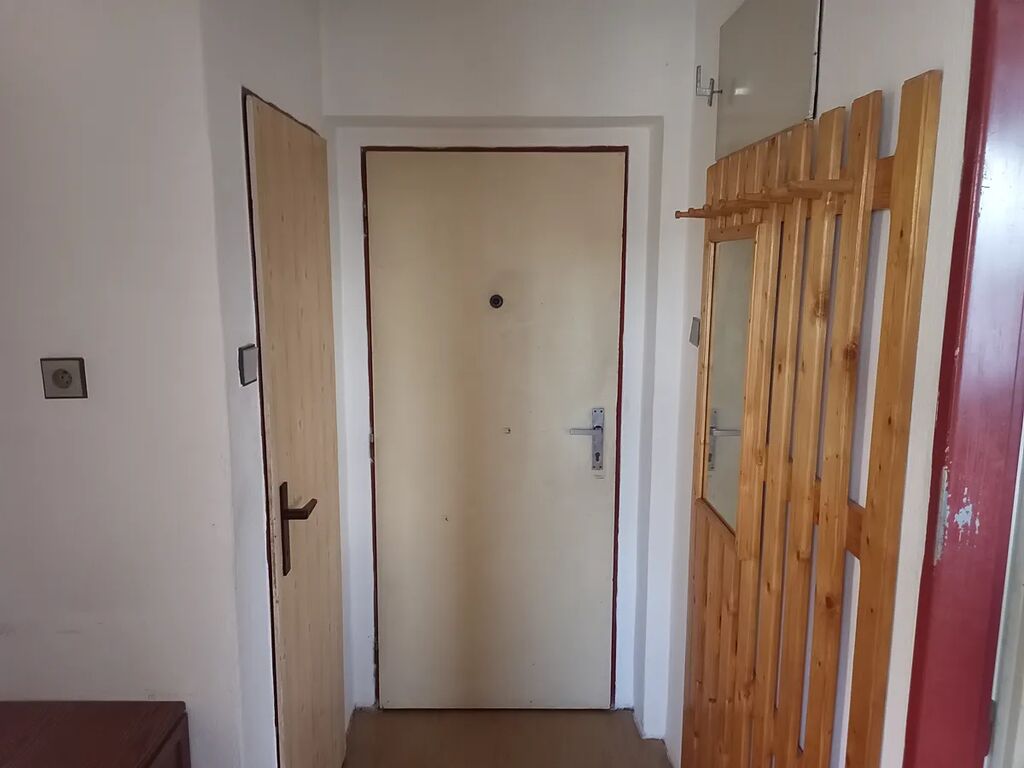 Vstup do bytu je řešen předsíní (chodbou) s šatní stěnou, dále navazuje vstup do kuchyně proti hlavním dveřím. Napravo je umístěné samostatné WC a samostatná koupelna se vstupem do technické místnosti s el.bojlerem na ohřev vody. WC je vyvýšené a vybavené madlem pro lepší stabilitu a sprchový kout disponuje sklopným sedátkem. Po obou stranách kuchyně jsou pak dva samostatné pokoje stejné velikosti sloužící jako obývací pokoj a ložnice. K bytu přináleží sklepní prostor o ploše 3,00 m2 a společné prostory.