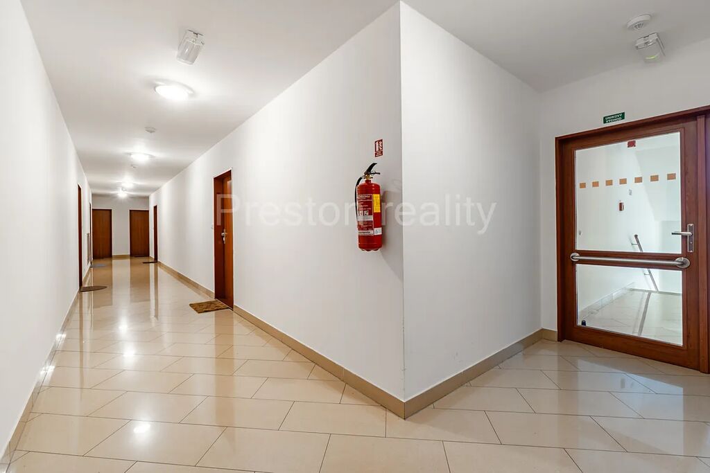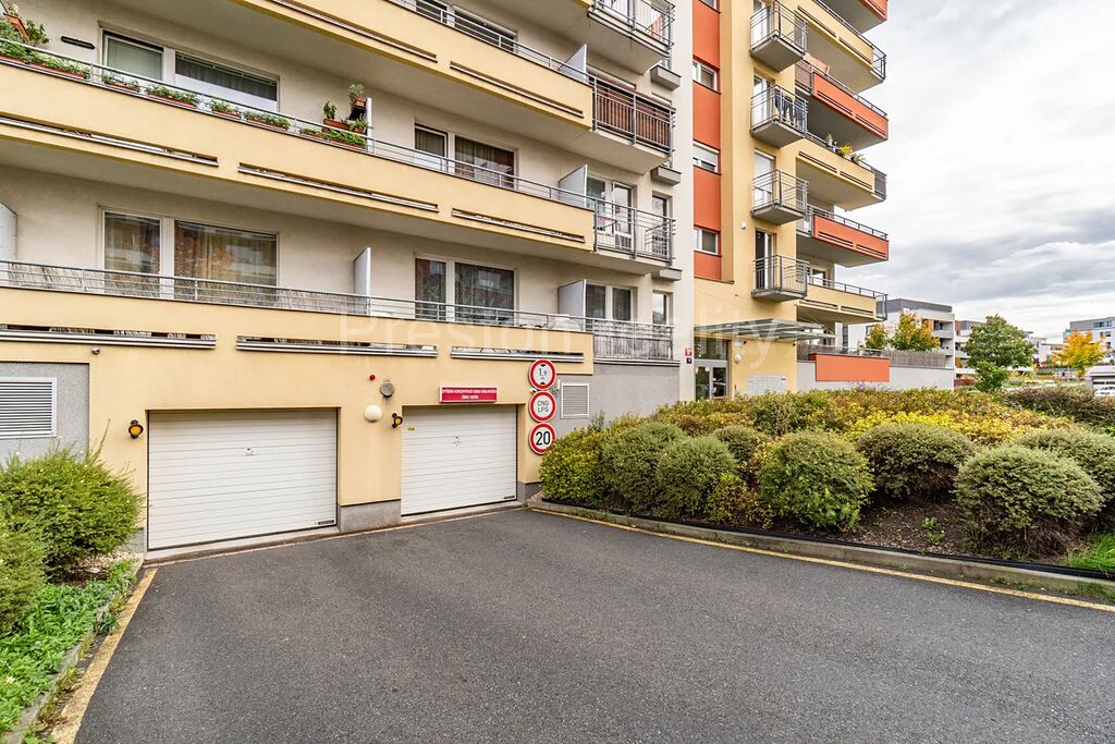 Bytu dominuje hlavní obývací pokoj s kuchyňským koutem (30 m2). Moderní kuchyňská linka je plně vybavena (elektrická trouba, mikrovlnná trouba, sklokeramická varná deska, lednice mrazák). Z obývacího pokoje je vstup na větší balkón (3,5 m2). V další části bytu se nachází dva samostatné pokoje (11 a 12 m2), přičemž jeden z nich má vlastní menší balkón (2 m2). V prostorné koupelně (5 m2) s rohovou vanou je prostor pro umístění standardně velké pračky (šíře 60 cm). WC zvlášť. K dispozici je také praktická komora v bytě (2,3 m2) a velký sklep u garážového stání ve třetím podzemním podlaží. Garáž o ploše 19 m2 má rozměry 2,87 x 6,67 m, přičemž vjezd je vrata umožňují vjezd pro vozidla o maximální šířce 2,24 m a výšce 1,94 m. Velkokapacitní sklep má plochu 10 m2 a rozměry 5,6 x 1,7 m. Pár kroků od vstupních dveří od domu je k dispozici praktická kočárkárna.