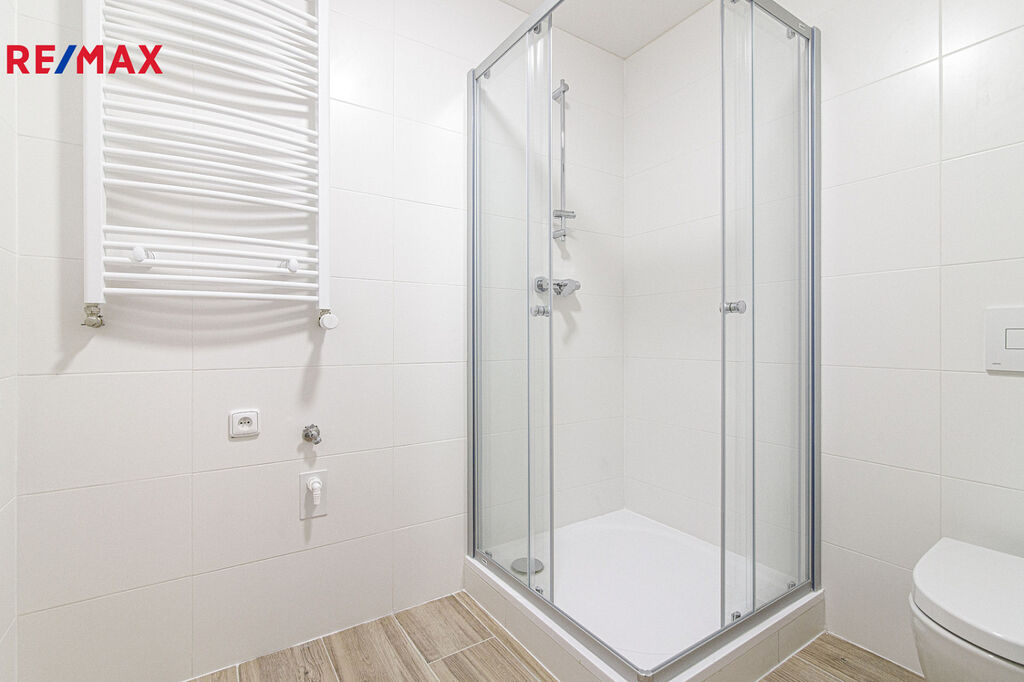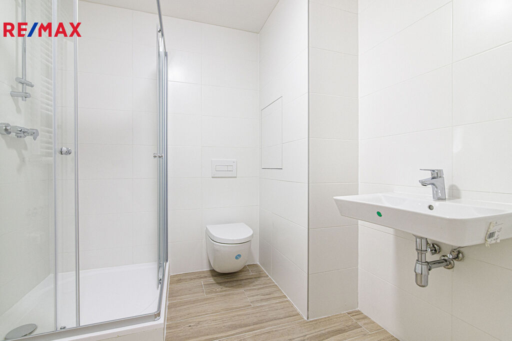 Byt disponuje moderní koupelnou se sprchovým koutem a toaletou, která je součástí jednoho celku – praktické a elegantní řešení v moderním stylu.