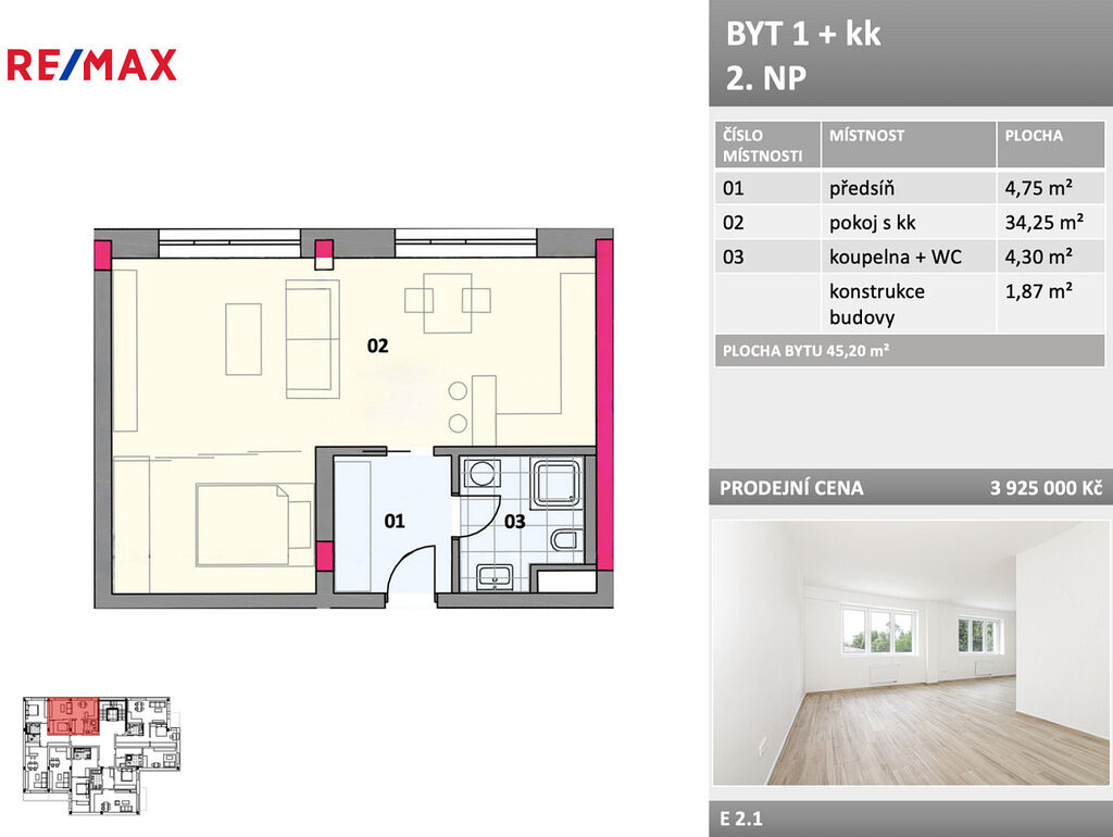 Tato prostorná a vzdušná bytová jednotka o ploše 45,2 m² se nachází v 2. nadzemním podlaží v sekci E, která je postavena jako první etapa projektu.