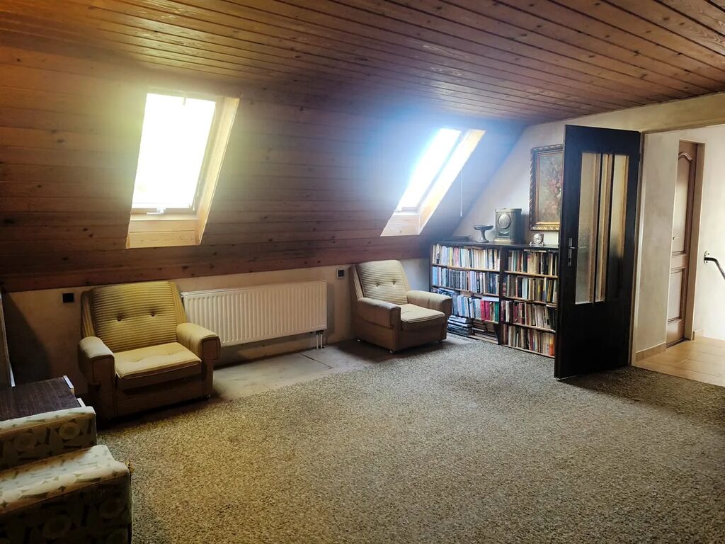 Za zádveřím jsou točité schody, které vedou do 2.NP, kde se nachází obytná místnost s kuchyňskou linkou, koupelna s wc a vanou, 2 komory a v půdním prostoru nad dílnou jsou dva průchozí pokoje se střešními okny pod sedlovou střechou.