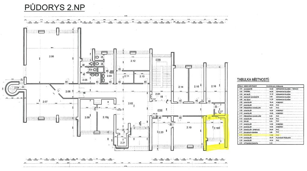 Kancelář č. 2.18 o výměře 11,9 m2 se nachází ve 2. nadzemním podlaží (NP).