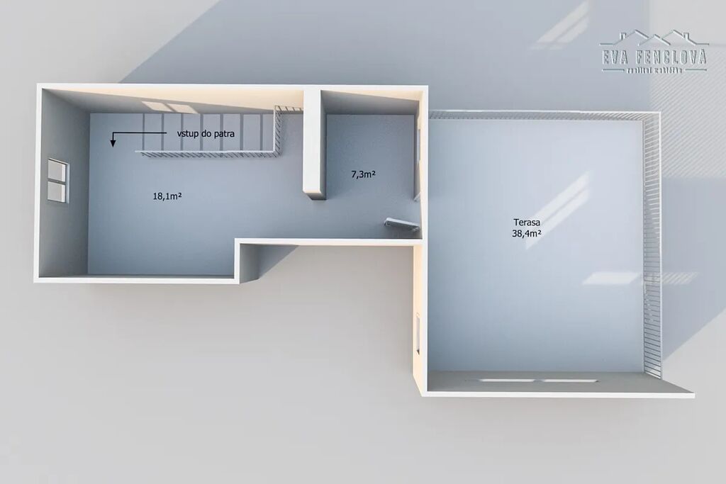 Z obývacího pokoje pak po dřevěných schodech vystoupáte do druhého podlaží, kde naleznete velkou ložnici s možností rozdělení na 2 pokoje.