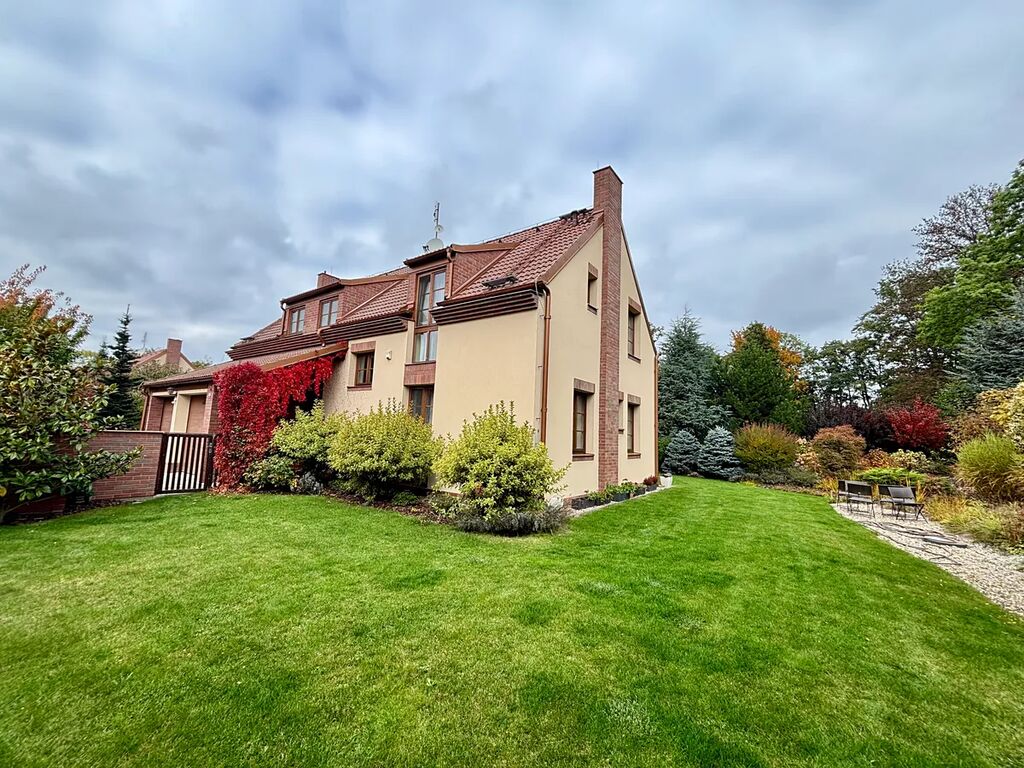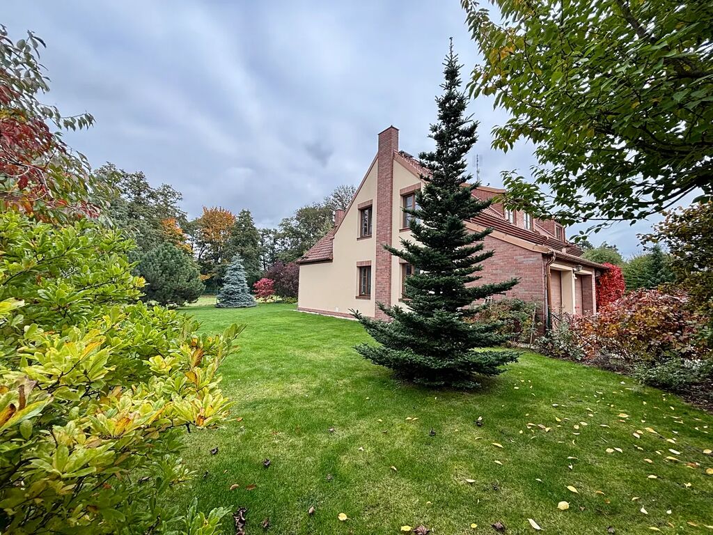 Dovolujeme si Vám nabídnout velmi pěkný samostatně stojící prostorný rodinný dům ve velmi oblíbené, vyhledávané, klidné části obce Dobřejovice, Praha – východ, lokalita Mlýnský Rybník – rodinné domy anglického stylu v blízkosti zadní části Průhonického parku.
