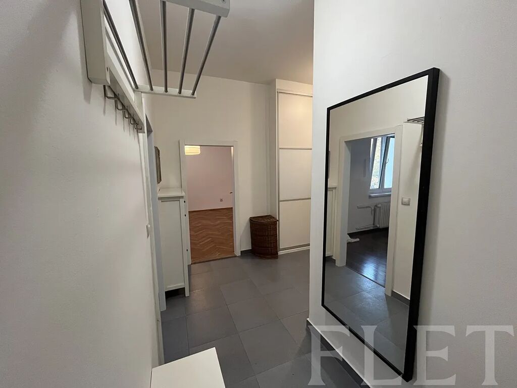 V bytě vás uvítá předsíň, ze které se dostanete do jednoho z menších pokojů, který můžete využít jako ložnici, dětský pokoj či pracovnu, do koupelny s vanou a na toaletu, která je samostatně.  Dále vstoupíte do hlavní místnosti, která vás oslní svým prostorem, je zde dostatek místa pro obytnou i jídelní část s kuchyňským koutem, který je laděný do dobového stylu a je vybaven elektrickou i troubou, varnou deskou a vestavěnou lednicí s mrazákem. Na tuto místnost navazuje další pokoj oddělený prosklenými dvoukřídlými dveřmi. Z hlavní místnosti se také dostanete na velkou lodžii s výhledem do klidného vnitrobloku.