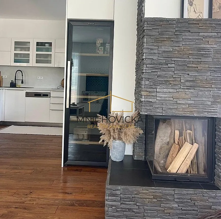 Celé přízemí je otevřené, světlé, dispozičně velmi zajímavě řešené, s výstupy na prostornou terasu 60 m2, zhotovenou z velmi tvrdého, tropického dřeva Garapa. V obývacím pokoji nechybí moderní krb, vytápění domu zajišťuje plynový kotel s napojením v přízemí na podlahové vytápění, v patře na radiátory, centrálně ovládané prostřednictvím aplikace např. přes mobilní telefon.