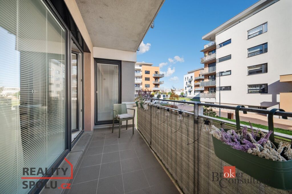 Byt o celkové podlahové ploše 58 m² nabízí dispozici vstupní chodby, obývací pokoj s kuchyňským koutem, jeden samostatný pokoj, koupelna s vanou, samostatné WC a komora. K bytu náleží balkony o velikosti 5,16 m² - přístupný jak z obývacího pokoje i ložnice. Součástí prodeje je také sklepní kóje s výměrou 2,13 m² a garážové parkovací stání 21 m².