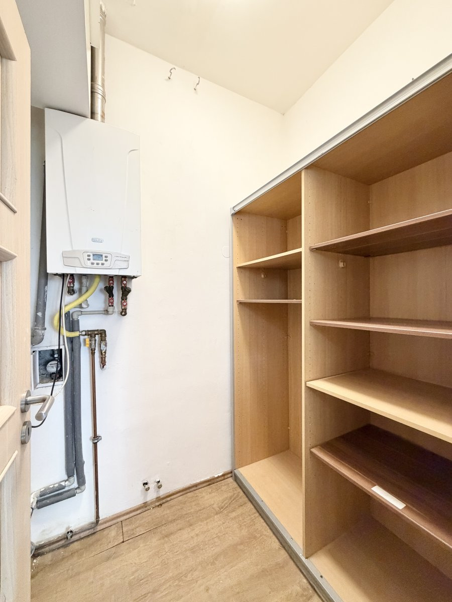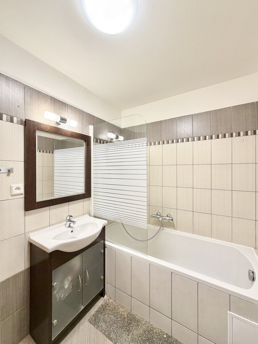 Byt se nabízí částečně vybavený. Kuchyně disponuje lednicí, myčkou, elektrickou troubou, sporákem, mikrovlnnou troubou a digestoří. Obývací část je zařízena dvěma vestavěnými skříněmi. Dále v bytě najedeme prostornou komoru s úložným prostorem. V koupelně je vana a toaleta.