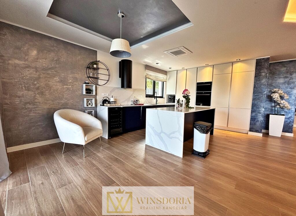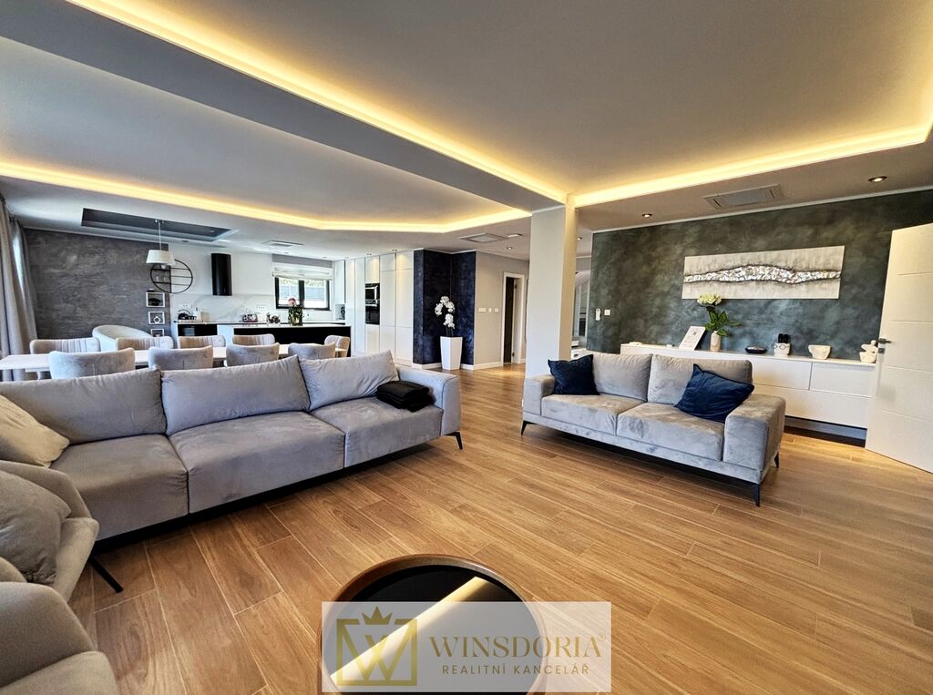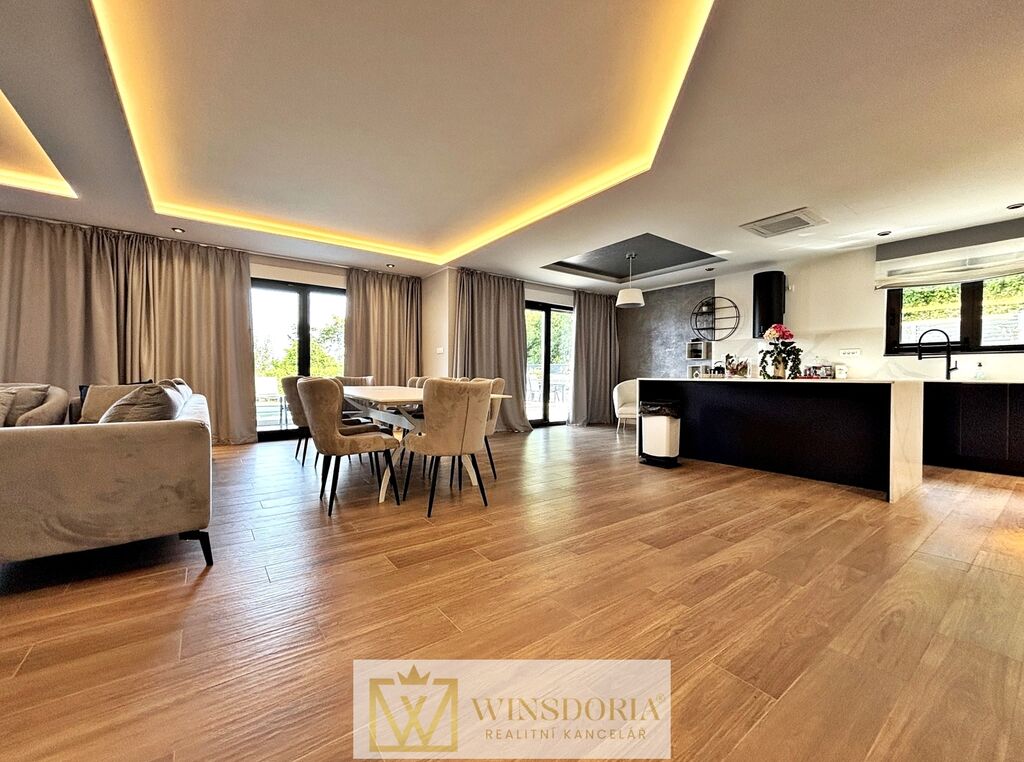 Dům je vybaven hliníkovým truhlářstvím s elektrickým ovládáním žaluzií, tepelnou fasádou, klimatizací ve všech pokojích a elektrickým podlahovým vytápěním v koupelnách. Prodává se kompletně zařízený.