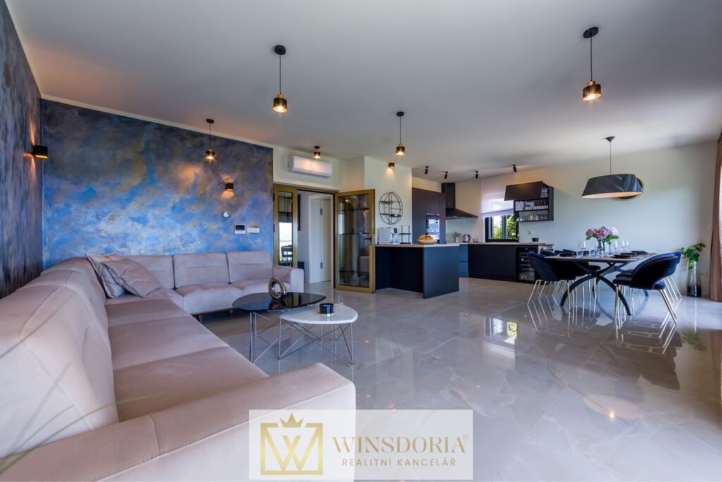 Nemovitost se rozkládá na dvou podlažích a svým promyšleným dispozičním řešením a kvalitním provedením uspokojí i náročné klienty. V přízemí se nachází prostorný obývací pokoj propojený s elegantní kuchyní a jídelnou. Prosklené stěny zajišťují dostatek denního světla a přímý vstup na terasu s výhledem na moře.