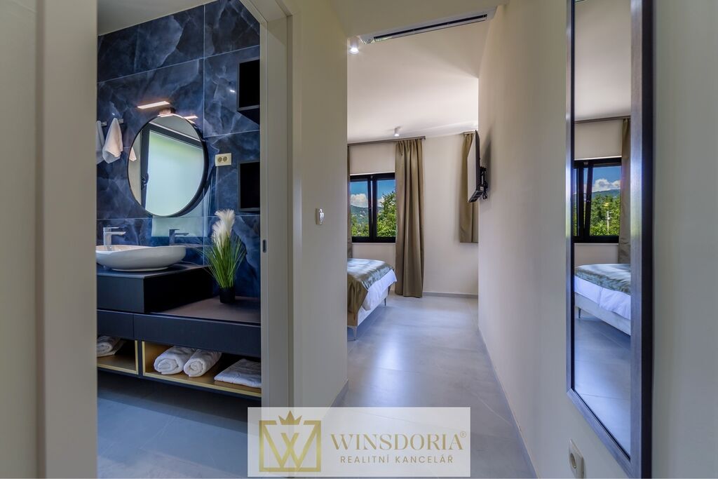 V klidné lokalitě Oprić, nedaleko Lovranu a Opatije, se nabízí k prodeji exkluzivní samostatně stojící vila moderní architektury s vyhřívaným krytým bazénem a panoramatickým výhledem na celý Kvarnerský záliv.