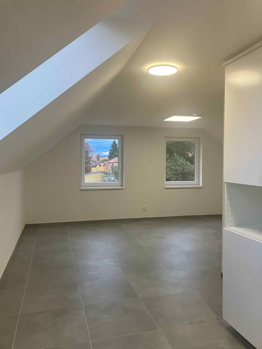 Podkrovní bytová jednotka disponuje novou prostornou kuchyňskou linkou zn. Ikea, v barvě bílá-mat, s dostatkem pracovního i úložného prostoru, vč. nových spotřebičů: indukční varné desky, ele. trouby, digestoře a místa pro myčku nádobí. Prostorná koupelna je dobře větratelná a s denním světlem, naleznete zde vanu, umývadlo, WC, žebřík-topení, přípojku na pračku. Malá chodbička-zádveří. Všechny místnosti jsou osazeny světly Vytápění: plynový kotel+podlahové topení. Nová plastová okna, nové dveře vč. obložek. Podlaha: kombinace dlažby a plovoucí podlahy v ložnici. Součástí nabídky je také možnost parkování 1x vozidla na společném dvoře, což je v současné době velkou výhodou. Max 2 dospělé osoby, podmínkou nekuřáci a prosíme bez domácích mazlíčků. Prohlídky i možnost nastěhování listopad 2025.