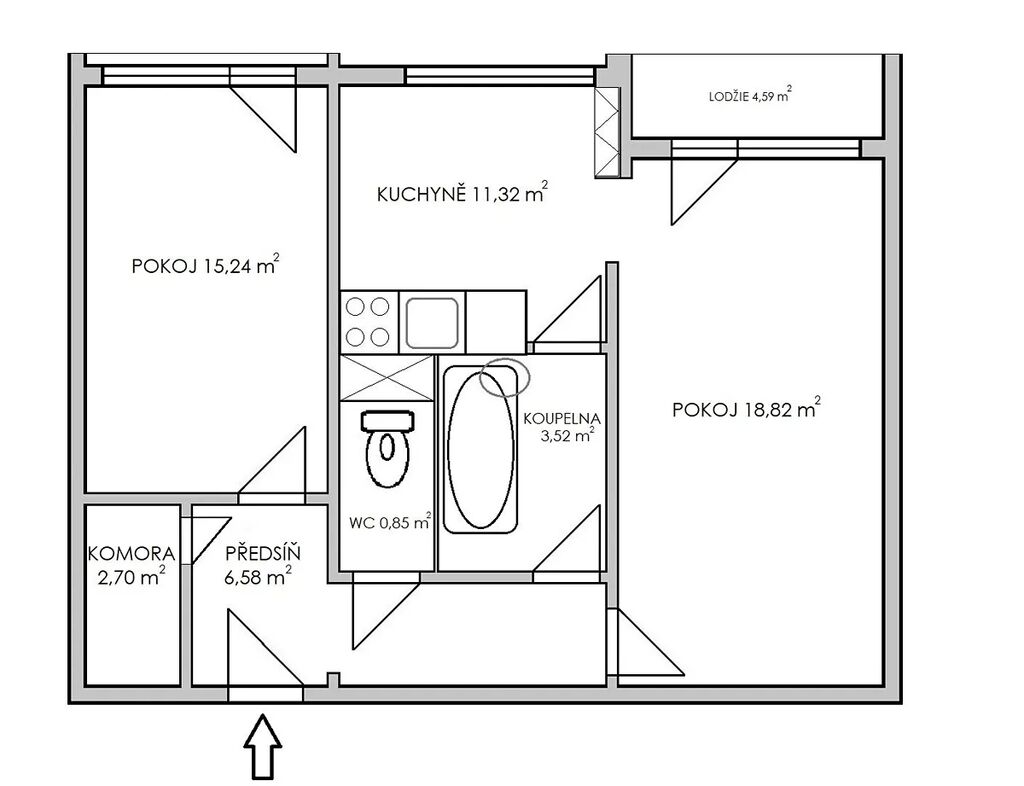 Celková užitná plocha bytu je 59,03 m2 + lodžie 4,59 m2, celková plocha tedy činí 63,62 m2. Byt disponuje vstupní chodbou, samostatným WC, koupelnou s vanou, obývacím pokojem se vstupem na lodžii, přičemž celá stěna je unikátně prosklená až k zemi, samostatnou kuchyní s dostatkem prostoru pro jídelní kout, samostatnou ložnicí s francouzským oknem a dále praktickou prostornou komorou. Orientace oken je de facto na jih a zajišťuje dostatek světla a nádherný výhled.