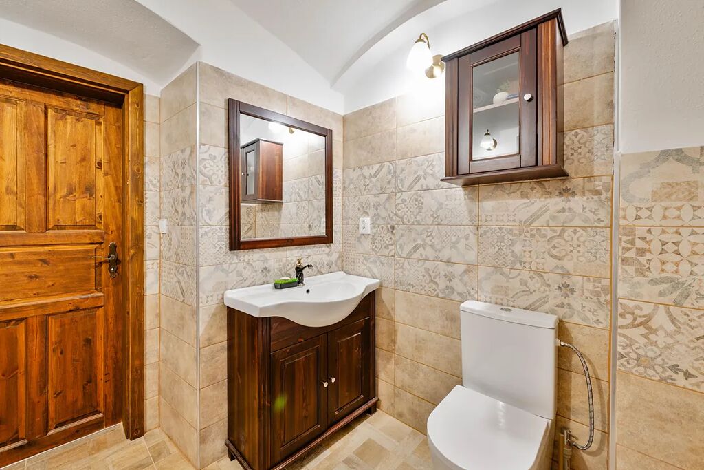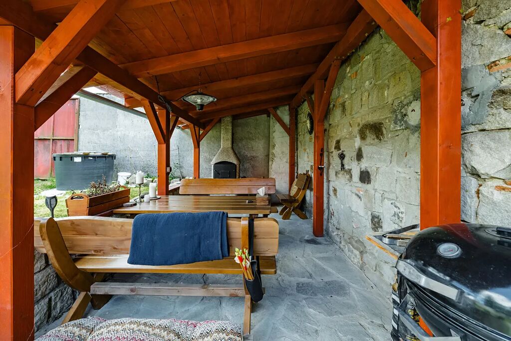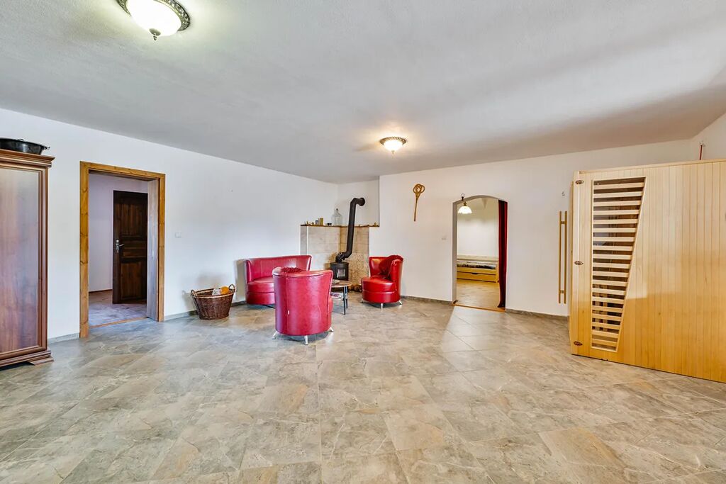 • Obytná část: Zcela nově zrenovována, včetně nové vodoinstalace a elektroinstalace, skladby podlah a zateplení stropů. Téměř každá místnost je vybavena malými krbovými kamny. Zároveň je zde sauna k relaxaci.