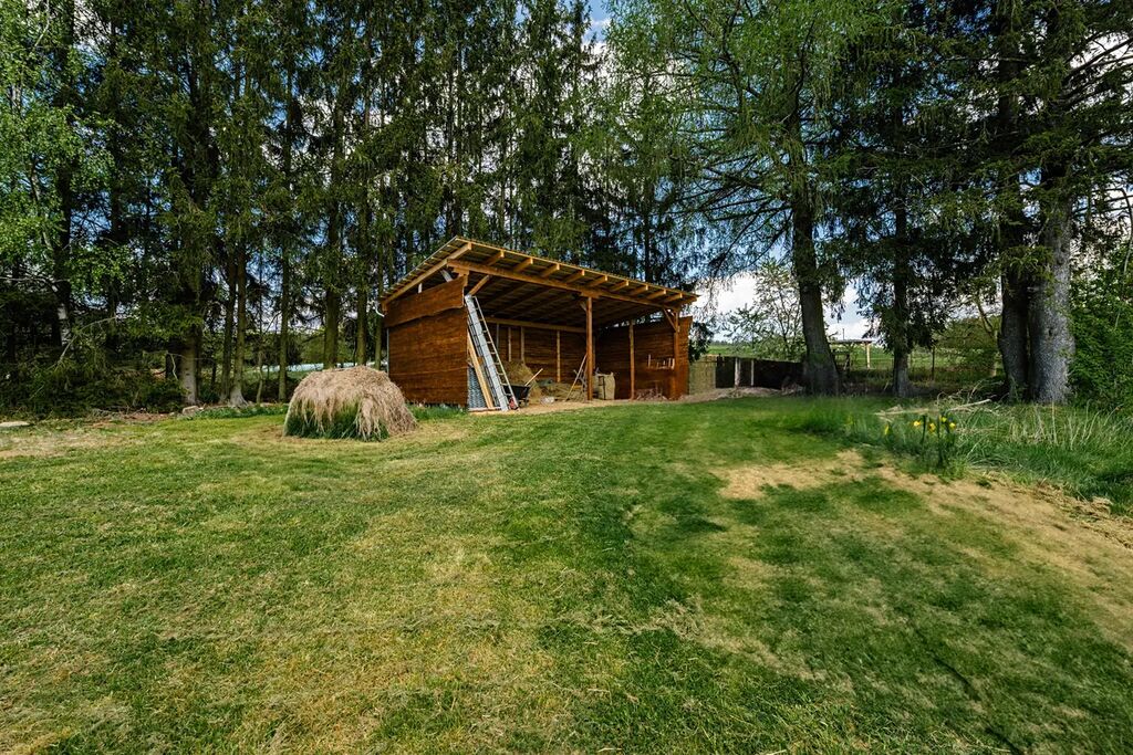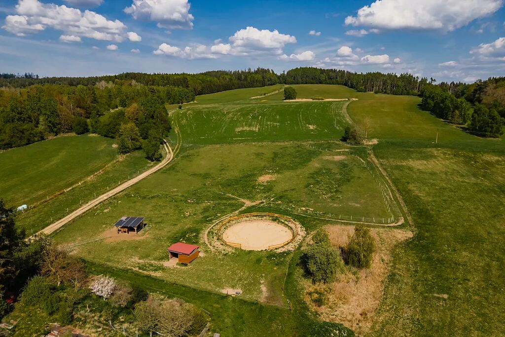 • Nově vybudovaný seník, jezírko a několik vzrostlých ovocných stromů.