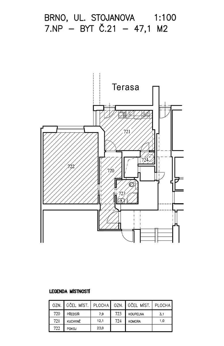 Byt nabízí užitnou plochu o velikosti 60 m², což zahrnuje také terasu o rozloze 13 m², která je ideálním místem pro relaxaci po náročném dni. Byt je orientován tak, aby poskytoval dostatek světla a zajišťoval Vám příjemné bydlení.
