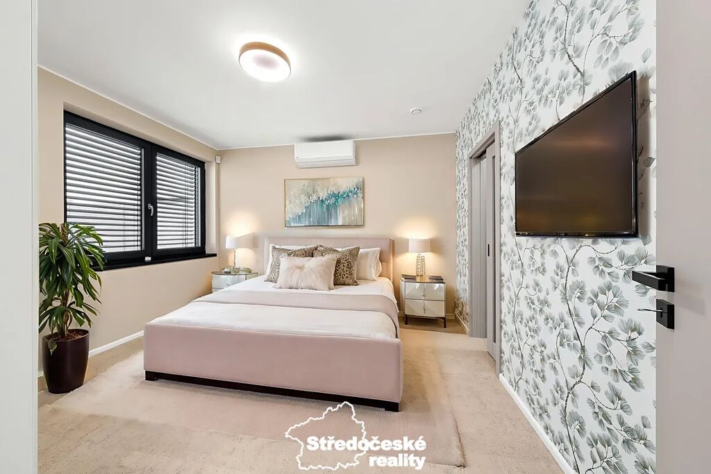 - hlavní ložnice s vlastní koupelnou (vana, sprcha, 2× umyvadlo) a šatnou (celkem 23 m²)