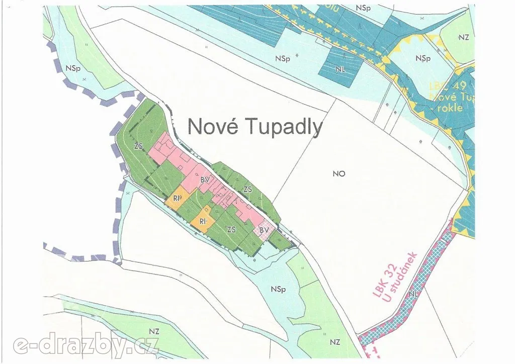 Předmětem dražby jsou nemovité věci nacházející se v místní části Nové Tupadly - viz přiložená mapa. Pozemky jsou užívány jako ostatní plochy. Na pozemcích se nachází bezcenné nálety. Podle územního plánu se jedná o plochu NSp - plochy smíšené nezastavěného území. Pozemky se nachází v chráněné krajinné oblasti. Nejedná se o stavební pozemky.